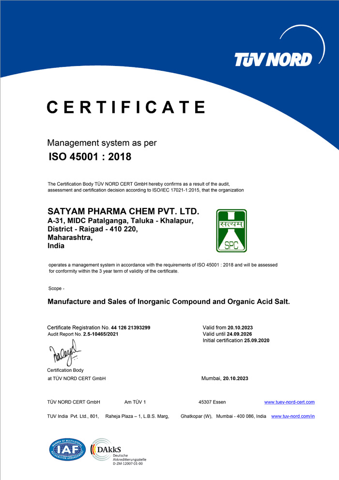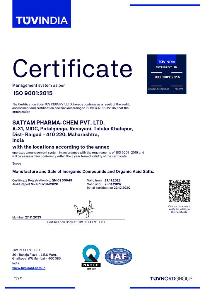 Fundada em 1981 em Mumbai, na Índia, a SATYAM é uma empresa produtora de produtos químicos especializados à base de metal com uma base de clientes estabelecida em mais de 35 países em todo o mundo. Em estreita colaboração com os seus clientes, a SATYAM oferece classificações, especificações e embalagens personalizadas que se adaptam da melhor forma a cada aplicação. A fábrica de produção da SATYAM está certificada de acordo com as normas IATF 16949, ISO 9001, ISO 14001 e ISO 45001. Com um sistema de controlo de qualidade de classe mundial, a SATYAM oferece também serviços técnicos e analíticos aos seus clientes.